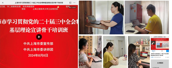 8月8日,工会党支部积极组织工会干部在线参加上海市学习贯彻党的二十届三中全会精神基层理论宣讲骨干培训,聆听上海市学习贯彻党的二十届三中全会精神宣讲团成员郭庆松的《闪耀着马克思主义真理光辉的政治宣言书——深入学习贯彻党的二十届三中全会精神》、沈开艳的《发挥经济体制改革牵引作用,全面推进中国式现代化——党的二十届三中全会精神解读》讲座。