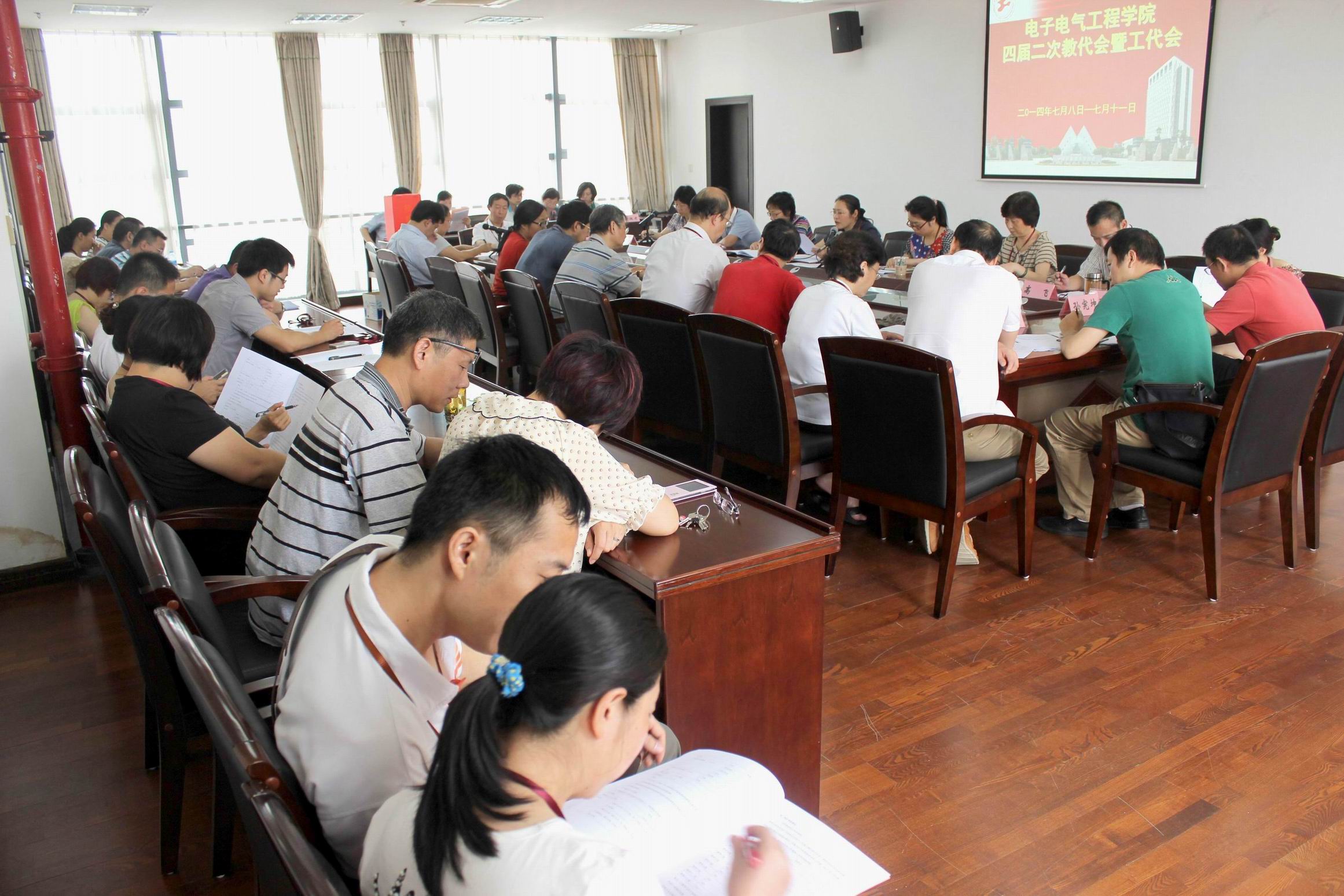 7月11日上午,电子电气工程学院四届二次教代会暨工代会闭幕式在行政楼B402举行会议,全体教代会暨工代会代表参加了会议,学院工会主席施一萍同志主持了主持。