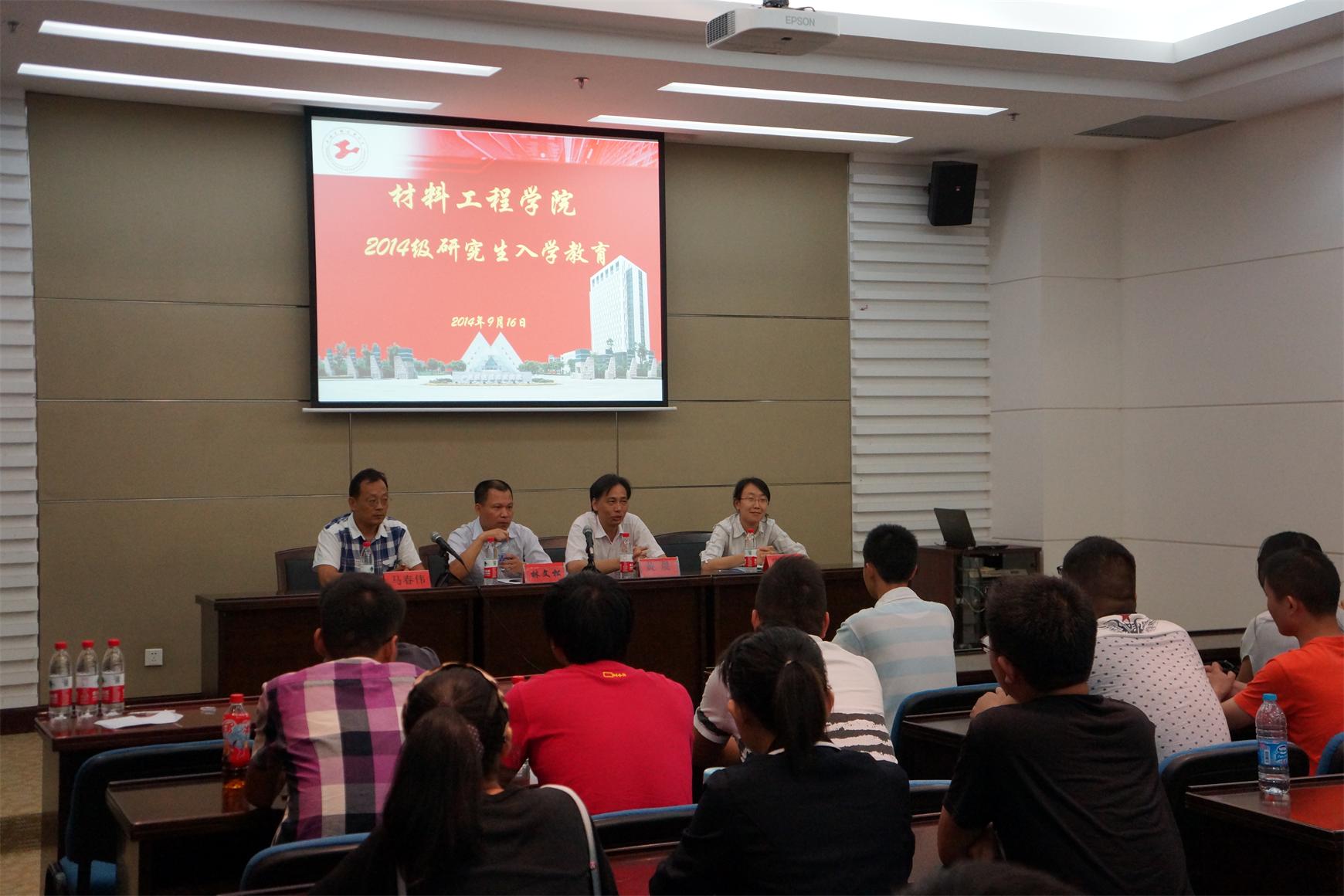 9月16日下午,材料工程学院在图文信息中心第四报告厅举行2014级研究生入学教育活动。参加会议有学院副院长林文松、实验中心主任黄晨、研究生秘书马春伟,以及辅导员宋潇芃。
