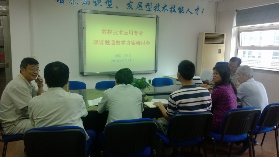 制造工程系副主任刘素华老师首先传达了暑期市教委关于双证融通工作的专题会议要求,说明了数控技术应用专业双证融通实施计划的框架与规范,前期的工作重点在于专业标准的开发与双证融通课程的确定。随后,与会的教师们以13级数控技术应用专业教学方案为蓝本,基于双证融通的专业人才培养目标,一门一门课程的进行论证与推敲,重新整合专业的核心能力结构,初步确定了5门双证融通课程、相应扩展课程和综合实训的具体课程。