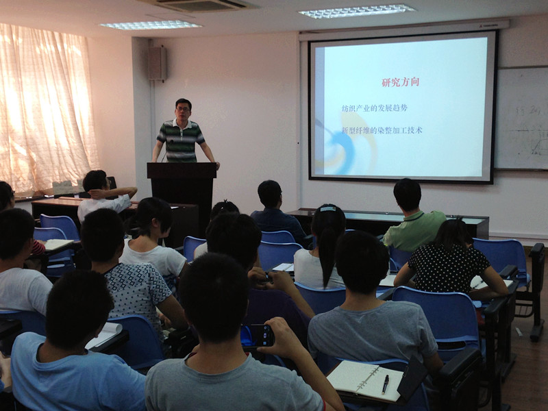会议开始,学院副院长沈勇教授首先介绍了硕士生研究与导师互选的基本要求,以及学生在选择导师的时候需要注意的问题。接着,纺织科学与工程、纺织化学与染整工程以及服装设计与工程三个研究方向的校内外导师介绍了自己的研究方向,并提出了自己对学生的要求。通过介绍,学生对自己将要学习的专业领域知识有了较好的认识,对于将来要选择的研究方向有了较明确的方向。最后学院院长胡守忠教授对会议进行总结,他希望学生能尽快熟悉自己的研究领域,及时确定导师和研究方向,尽快投入到学习和研究工作中去。