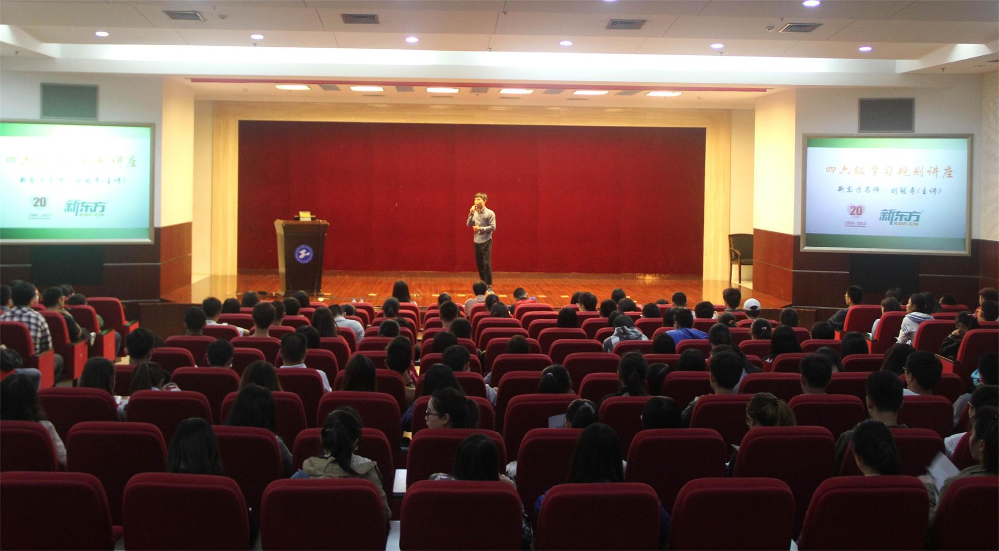 讲座伊始,主持人播放了新东方的宣传视频,介绍了新东方由1993年创办开始时仅有13人的课堂发展到如今中国最著名的语言教育机构的艰辛历程,也向同学们传达了新东方“永不言弃,为梦想而生”的宗旨。