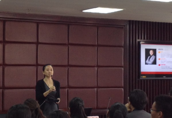 陈宇珏校友受到了全场观众的热烈欢迎。同学们均对本次讲座表现出极大热情和浓厚的兴趣。陈宇珏首先向大家介绍了自己,同时送给了大家自己的格言快乐工作,快乐生活。她说“工作本就属于生活,唯有快乐的工作,才会有快乐的生活。”这样简单而富有哲理的格言引得大家纷纷点头,表示赞许。