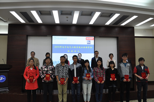 11月1日是我校建校36周年在日子,广大校友应邀纷纷返校参加校园开放日活动。下午,电子电气工程学院在图文信息中心第三报告厅举办2014年社会奖学金颁奖仪式。来自德国倍福自动化有限公司的校友,华东销售总监夏则才先生,学院党委茅蕾书记,学院党委秦颖副书记,副院长张莉萍、邓琛、曾国辉,学院院长助理高飞出席颁奖仪式,学院工作办公室全体老师,在读学生代表和获奖同学参加颁奖仪式,秦颖副书记主持了此次颁奖仪式。