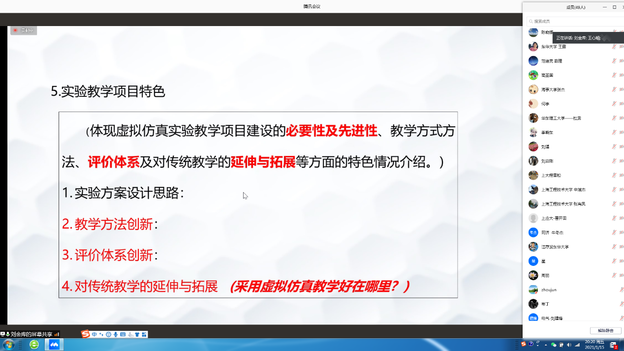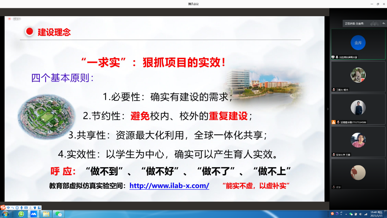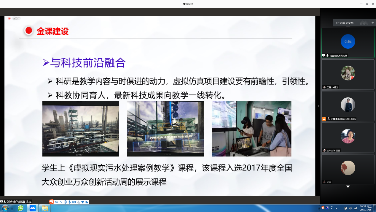 为进一步激发我校教师对虚拟仿真实验课程建设的申报热情,帮助老师们精准把握虚拟仿真实验课程申报的要求和专家评审要求,为老师们在虚拟仿真实验课程建设方面提供实质性的帮助。1月15日晚,由我校教务处(教师教学发展中心)主办,上海泛境科技协办的虚拟仿真实验课程申报线上交流研讨会顺利举行,会议邀请了华东理工大学教务处副处长刘金库教授进行主旨报告,我校及复旦、同济、东华、上大、上理工等高校近50位教师参加了研讨。会议由教务处副处长唐永升主持。