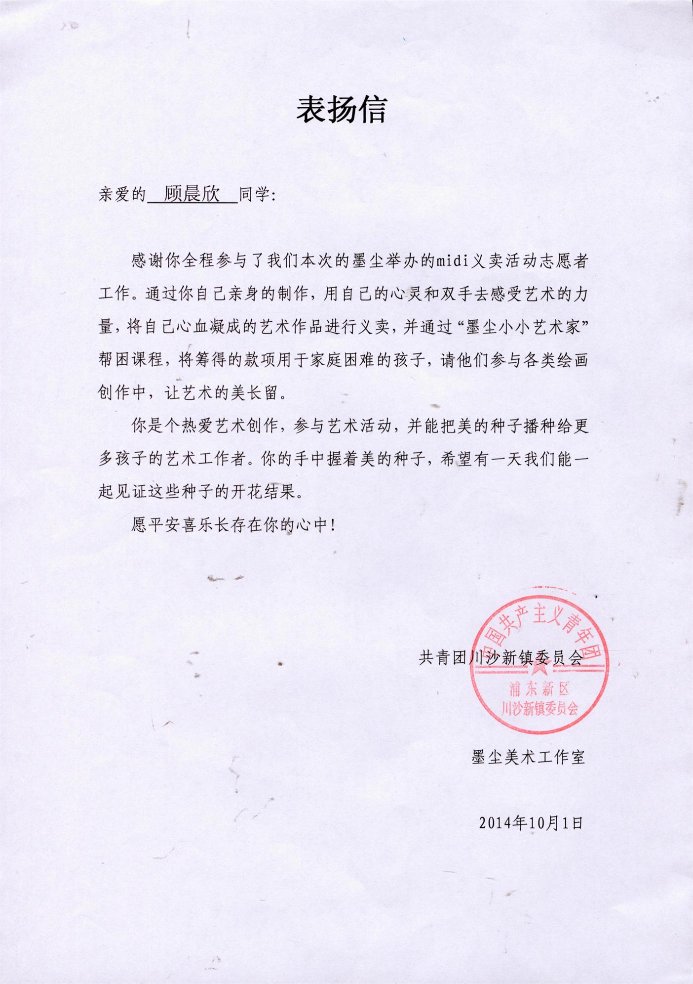 近日,中法埃菲时装设计师学院分团委收到了一封由共青团川沙新镇委员会与墨尘美术工作室联合撰写,有关学院1221123班顾晨欣同学积极参与志愿者义卖活动的表扬信。