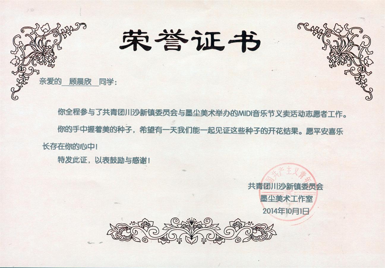 信中简要介绍了由墨尘工作室举办的midi义卖活动,给予了她一份荣誉证书,并对其在志愿者工作中所展现出的无私奉献与博爱精神表示了肯定和赞赏。