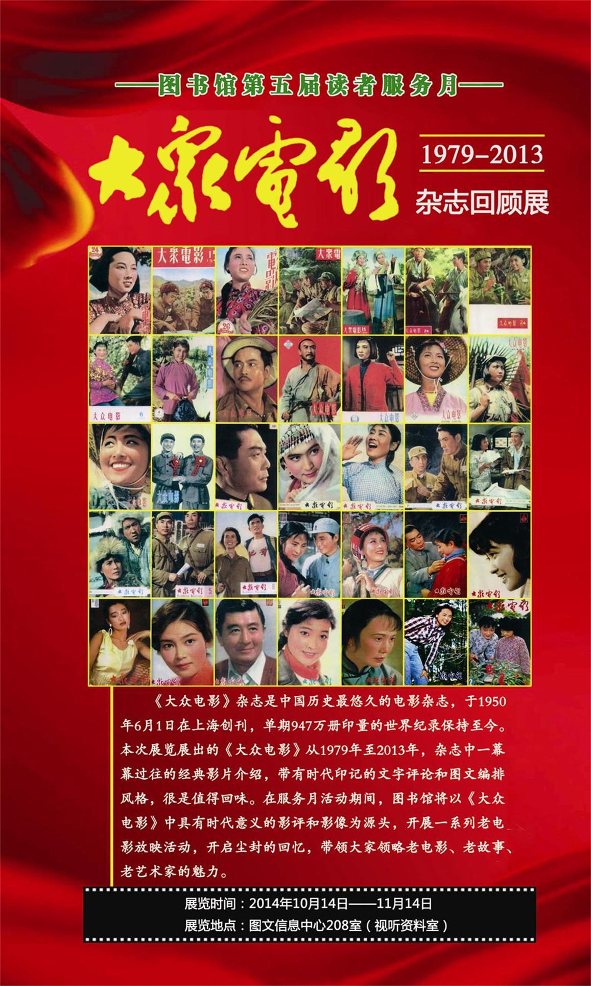 校庆期间,图书馆将以“电影点亮生活”为主题,在图文信息中心视听阅览室对全套《大众电影》杂志进行展览,同时,结合杂志经典影片介绍,开展“佳片有约”中国老电影展映活动。欢迎广大师生前往观摩,从中领略中国老电影、老故事、老艺术家的经典魅力。