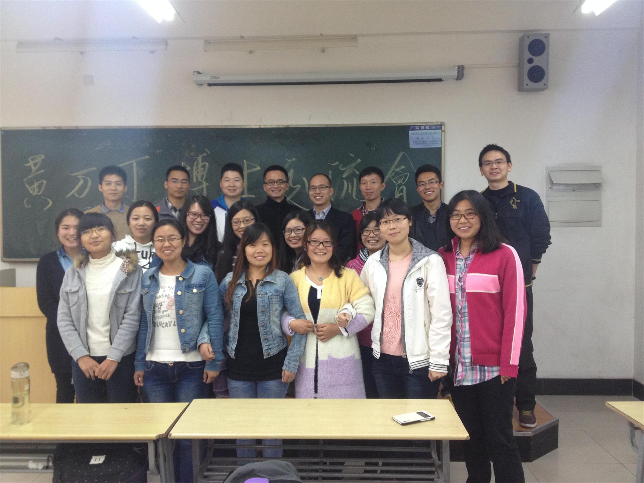 在交流会上,黄万丁博士首先表达了对母校的感激之情,然后从自身经历出发,指出考博需要明确目标,需要坚定信念,倘若信念不坚定,那么在考博的过程中极有可能半途而废。其次,黄万丁博士还指出考博不是死读书,也不是读死书,而是从大处着眼,从小处着手,平时注意积累理论知识和把握形势政策,只有这样才会不急不躁、循序渐进地进行复习。再次,黄万丁博士针对大家所关心的发表论文问题做出了详细解答。他指出论文写作不仅要抓重点,更要抓创新点,要贴合实际,在追求定量方法的同时开拓思路,创作出新的数据分析模型。最后,黄万丁博士坦言,作为一名研究生,我们不仅要关注学习,更要关注生活,并与大家合影留念。