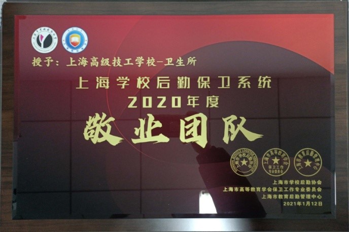 1月12日,上海市学校后勤保卫系统2020年度“感动人物”“敬业团队”“爱心企业”风采展示活动暨颁奖大会在上音歌剧院举行,高职学院、高级技校卫生所荣获2020年度“敬业团队”荣誉称号、保卫科戴金山同志荣获“感动人物”荣誉称号。