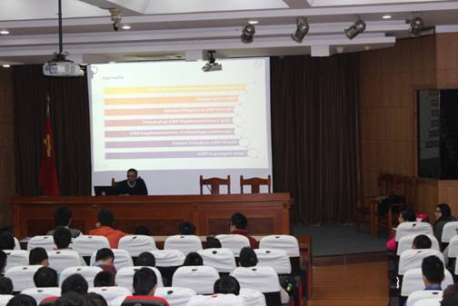 11月12日下午,外籍专家Sidhartha Tripathy应邀在高职学院综合楼11楼思进厅为全院师生作了题为《Emerging World of ERPs》的讲座交流。