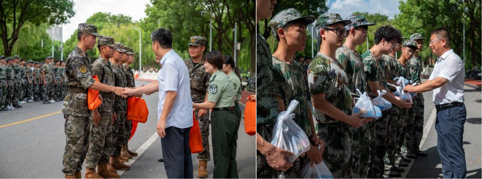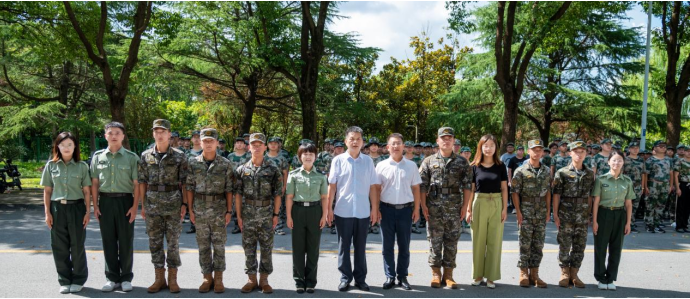 8月29日上午,材料科学与工程学院党委书记张朝民,院长李军,党委副书记刘倩一行在营地训练场慰问全体教官和受训学生。