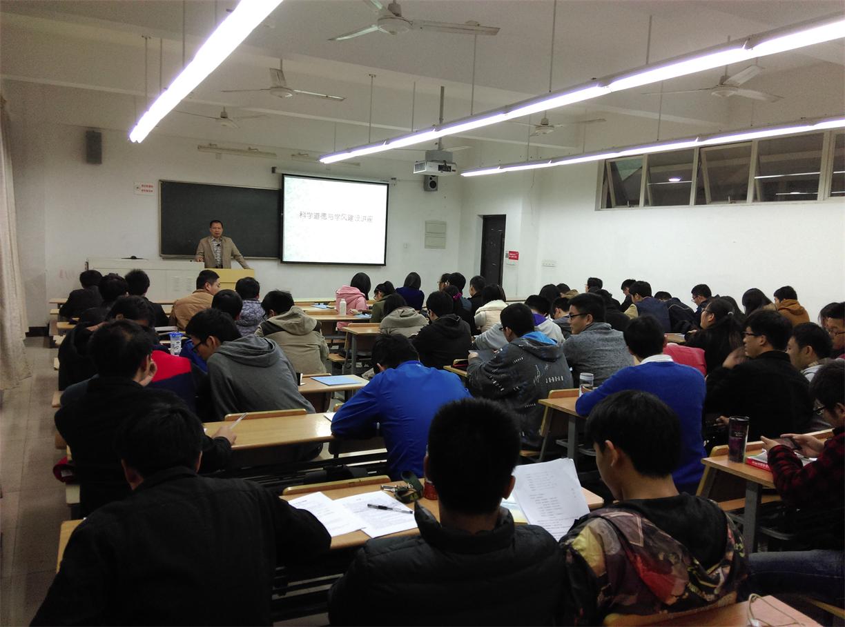 11月17日晚6:00,材料工程学院“学术道德与诚信”系列活动之“科学道德与学风建设讲座”在教学楼E102准时开讲。本次活动邀请了学院副院长林文松教授,林老师向材料工程学院2014级全体研究生与化工2014级研究生讲解了学术诚信的范畴及重要性。