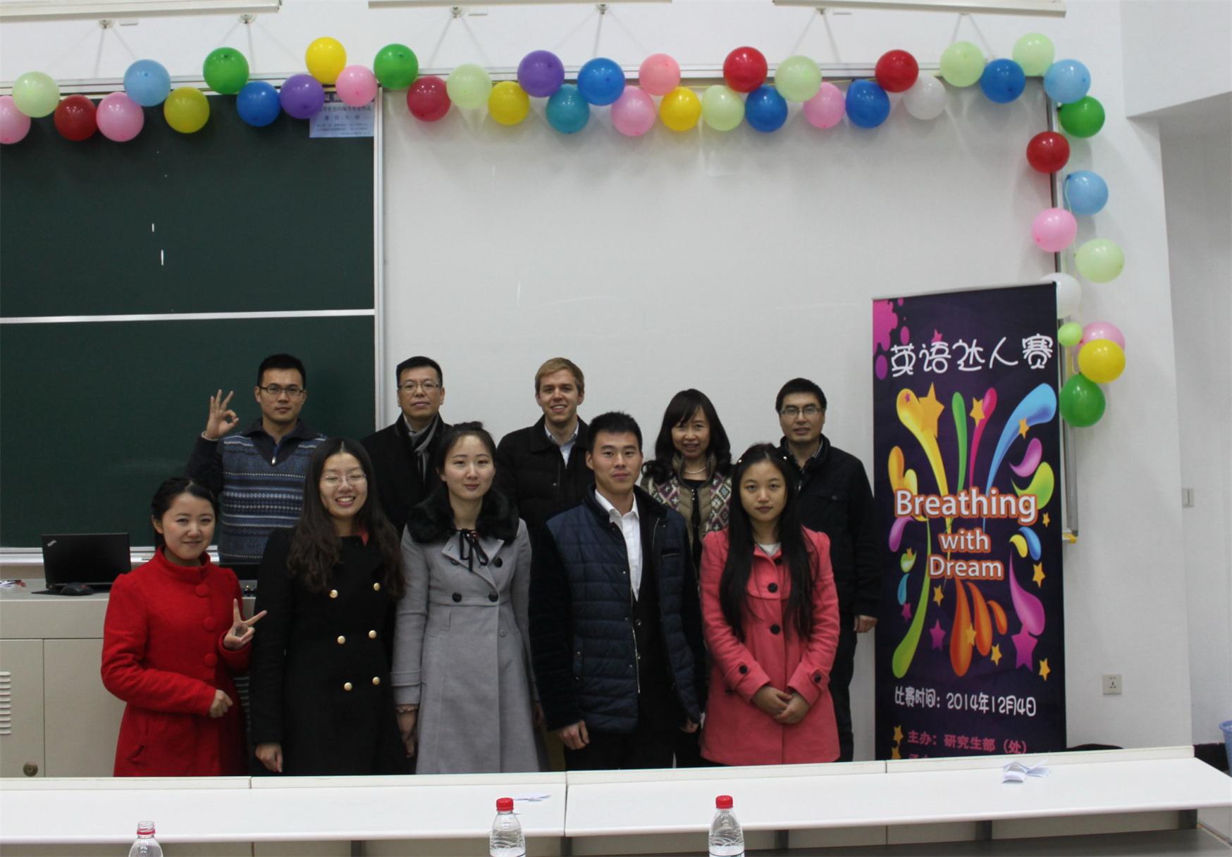 为营造良好的校园文化氛围,提升我校研究生的综合素质与创新思维,凝聚青年志,共筑青春梦,12月4日晚,由研究生部(处)主办,校研究生会(学术部)承办的“Breathing with dream”第六届研究生英语达人大赛在教学楼J302举行。本次竞赛由基础学院刘晓民副院长、张蓓老师和外教David老师担任评委,研究生处王成涛老师致辞,比赛吸引了百余名师生到场观看。
