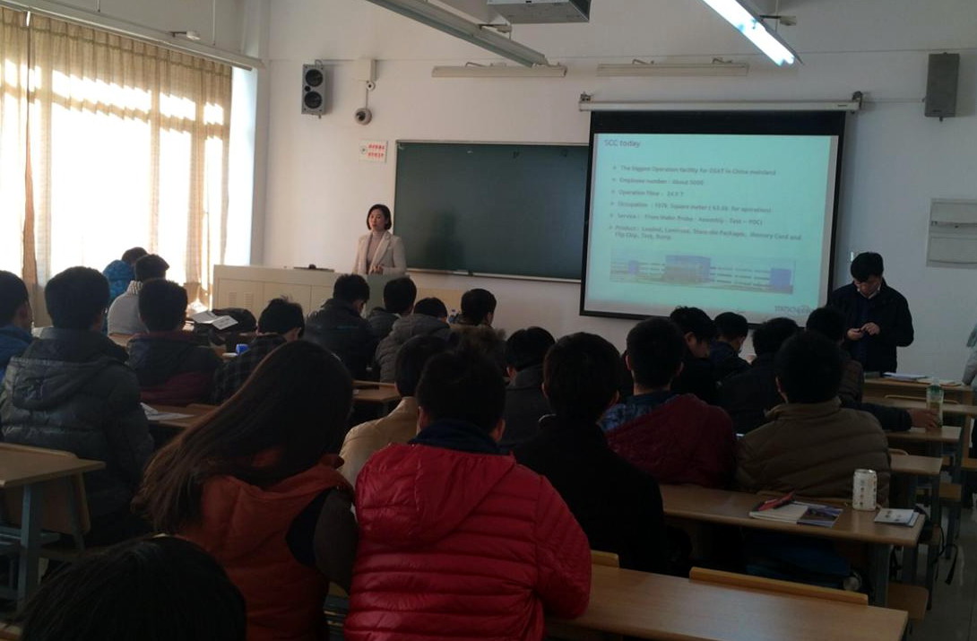 当日13:30,星科金朋(上海)有限公司于在教学楼D103召开了宣讲会。星科金朋(上海)有限公司的张经理和王经理不仅介绍了公司的文化背景,还介绍了公司对于新人的培训及管理方案,公司在“设计、生产、销售”的产业链中处于生产的位置,且其生产是外包的。公司在招聘结束至六月份这段时间内将安排培训,在毕业生毕业之前做整体评估。公司将为毕业生提供两方面的发展路线,技术路线以及管理路线。在薪酬待遇方面为实习期公司给予薪水80%的补贴,发放13薪,依据个人的表现发放年度奖金、加薪、职位晋升等。每月一次的员工活动比如篮球、排球、羽毛球等等。