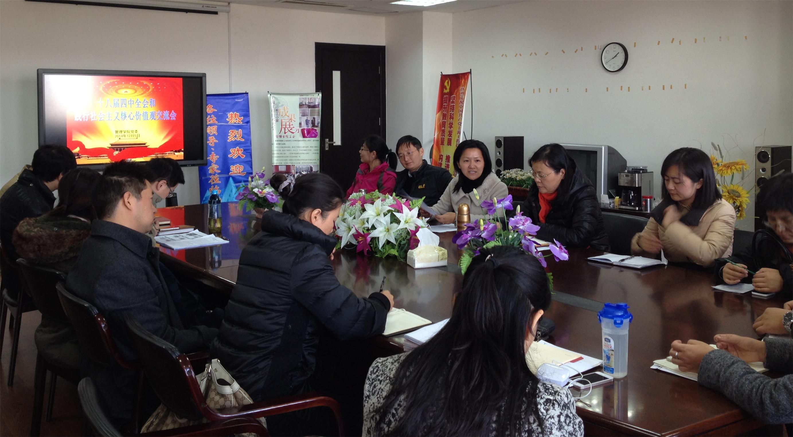 12月4日,为了纪念我国第一个“国家宪法日”,深入推进学院教师学习贯彻党的十八届四中全会精神,以从法治提高师德修养层面教育引导大学生群体培养和践行社会主义核心价值观,管理学院举办以“学习十八届四中全会精神,践行社会主义核心价值观”为主题的教师座谈会暨纪念首个“国家宪法日”活动。管理学院党委书记吴清老师、副书记范君晖老师及各系室的教师代表参加此次活动。活动由党委副书记范君晖主持。