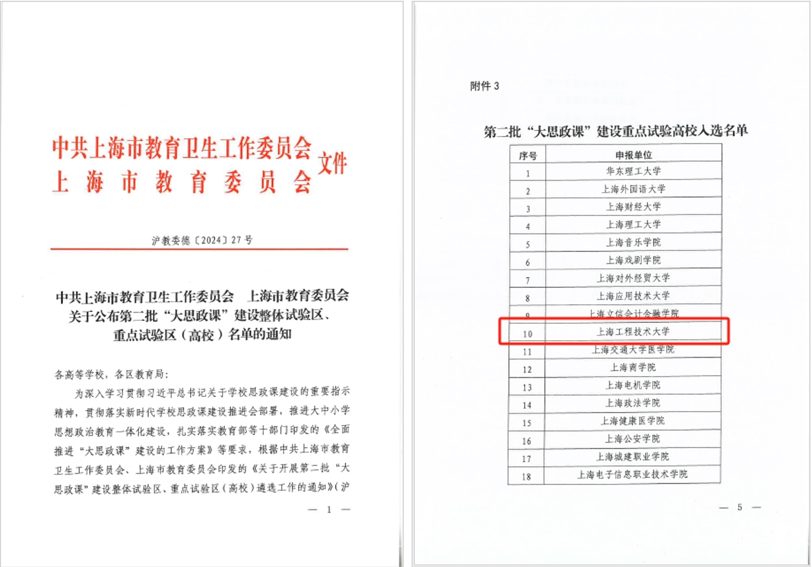 近日,中共上海市教育卫生工作委员会、上海市教育委员会联合发文公布了第二批“大思政课”建设整体试验区、重点试验区(高校)名单,上海工程技术大学成功入选第二批“大思政课”建设重点试验高校。这是学校在“大思政课”综合改革领域取得的新突破。