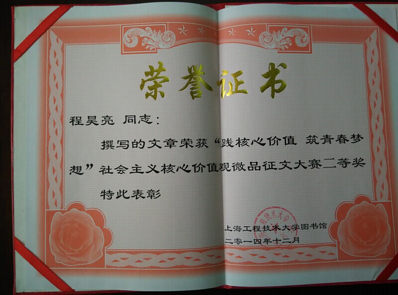 12月12日下午,由上海工程技术大学图书馆工会、图书馆党支部及溯羽亭书友会联合主办的“践核心价值,筑青春梦想”优秀图书微品征文大赛颁奖仪式在松江总校图文信息中心204室举行。高职学院基础教学部程昊亮老师的参赛作品荣获二等奖。