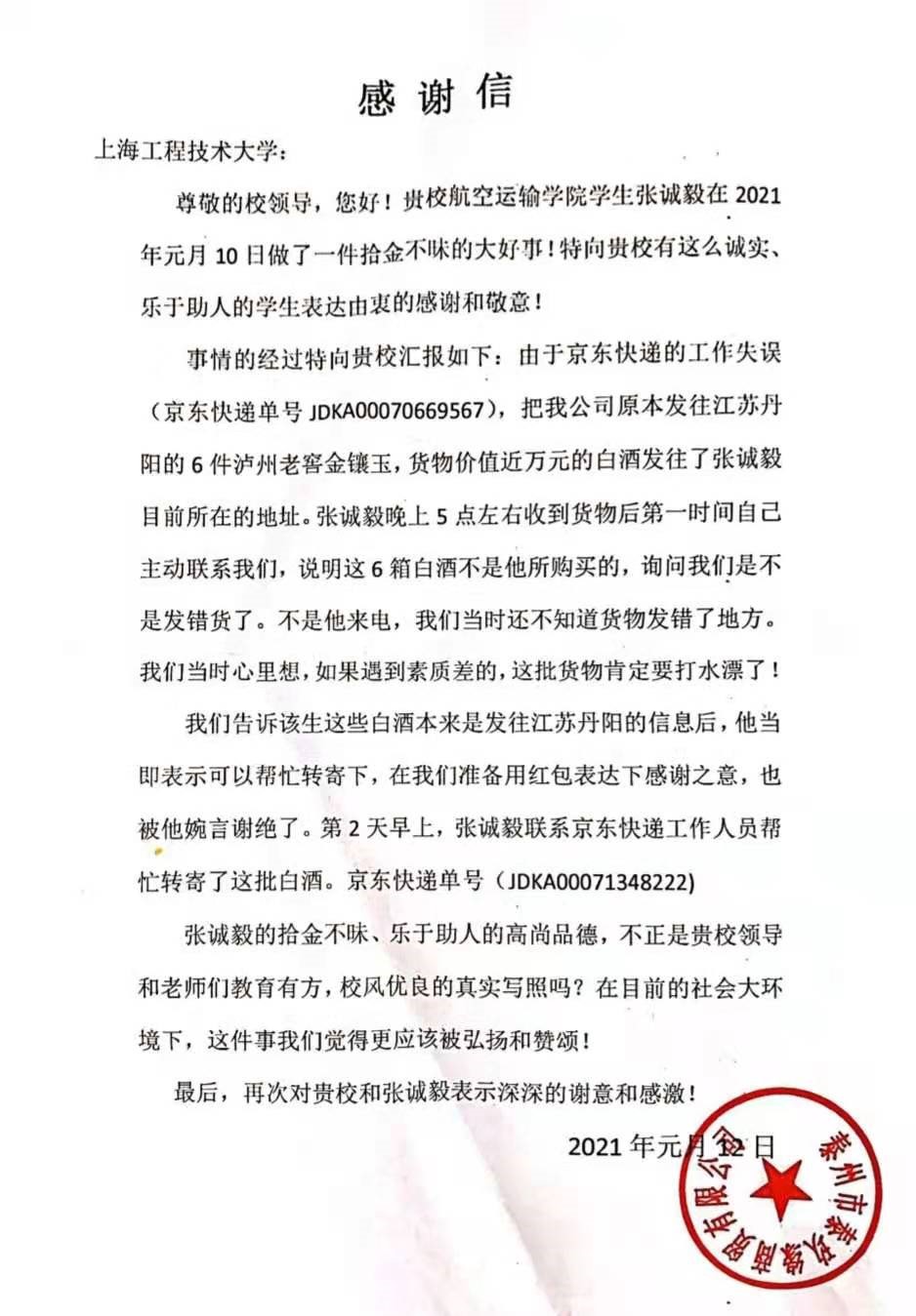近日,航空运输学院(飞行学院)收到了一封来自江苏泰州泰玖缘商贸有限公司的“感谢信”,对我院研究生张诚毅同学拾金不昧的行为表达了深深的感激之情。
