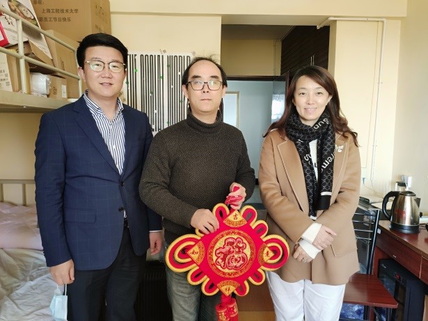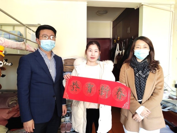 1月29日下午,艺术设计学院党委书记袁蓉,党委副书记刘江先后来到学生公寓三期14号楼,四期41号楼,六期30号楼、19号楼慰问1名留校教师和3名延迟离校、留校学生,为留校师生带去关爱、送去温暖。