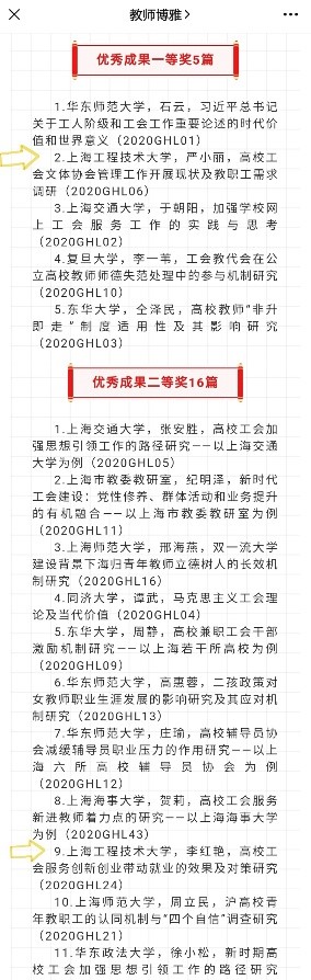2月5日,上海市教育系统工会理论研究会通报了2020年立项课题评审结果。经过层层评比,管理学院严小丽老师的《高校工会文体协会管理工作开展现状及教职工需求调研》研究成果荣获一等奖,管理学院李红艳老师的《高校工会服务创新创业带动就业的效果及对策研究》荣获二等奖,为学校工会理论研究工作再添殊荣。