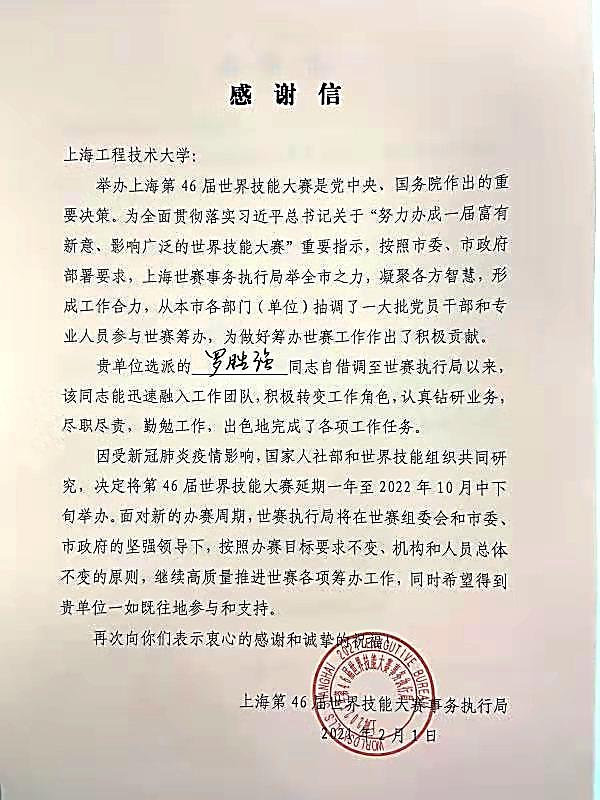 近日,我校收到了上海第46届世界技能大赛事务执行局发来的感谢信。感谢信充分肯定了我校为世界技能大赛筹办所作出的贡献。肯定从世赛研究中心借调至执行局的罗胜强副教授的工作表现。认为该同志能够迅速融入工作团队,积极转变工作角色,认真钻研业务,尽职尽责,勤勉工作,出色地完成了各项工作任务。