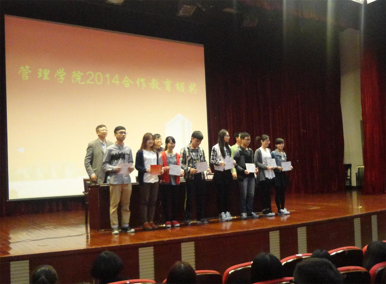在随后的表彰仪式上,学院吴清书记宣读了2014年产学合作教育优秀学员、优秀业务报告作者等个人奖项,并为获奖代表颁奖。孟勇副院长作了产学合作教育动员,向同学们介绍了产学合作教育准备阶段、实施阶段、总结阶段三个阶段的要求,强调了产学合作教育的意义和重要性。同时,孟勇老师给学生提出了三点希望和建议:在产学合作的过程中做每一件事情都要善始善终;要以主人翁的精神做真正的自己;要学会沟通、更要注意安全。接着,三位优秀学员代表分别从科研训练、企业实习、国际交流三个方面与大家分享了不同形式参与产学合作教育的亲身体验与感触,给学弟学妹们提供了宝贵的经验。