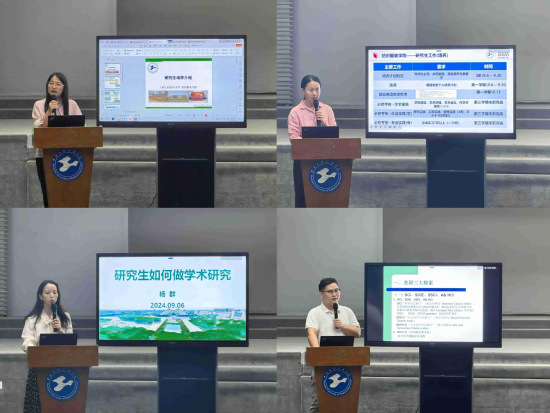 研究生秘书常文静对学院各个专业方向和导师进行了详细讲解,介绍了课程设置、实践活动及科研项目等。科研秘书杨群从研究课题的选择和申报入手,讲解了从选题到申报的流程细节,为新生们传授了如何做好学术研究的宝贵经验。研究生秘书陆赞则详细介绍了论文撰写要点,如文献检索、论文引用、格式说明等,对研究生学位申请条件进行了说明,并提醒新生要及时了解和掌握相关的学位申请要求,以确保顺利完成学业并获得学位。