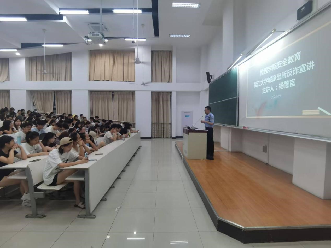 松江大学城派出所的杨警官应邀为学生们开展反诈宣讲。他结合实际案例讲解了常见的诈骗手段和防范技巧,提醒学生们提高警惕,保护好自己的财产安全。