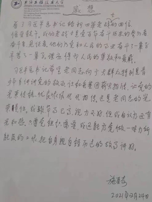 2月18日,习近平总书记给上海市新四军历史研究会的百岁老战士们回信,向他们致以诚挚问候和美好祝福。习近平总书记的回信引起了工程大离退休党员、关工委委员们的热议。