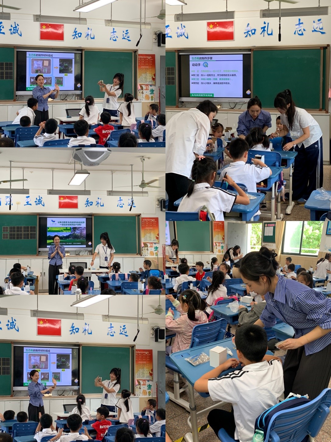 团队教师首先为上外松外的小朋友们带来了一场题为“了不起的绿色力量”的科普讲座,通过丰富的图文生动讲解了植物在生态系统中的关键作用,特别是树木在涵养水源、净化空气、调节气候、维持生物多样性方面的重要贡献。在实践体验环节,团队教师带领小朋友们开展生态瓶制作,通过动手实践,小朋友们初步了解了如何构建和维护健康的生态系统,加深了对生态循环和环境保护的认识。