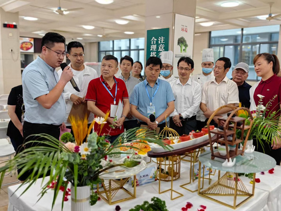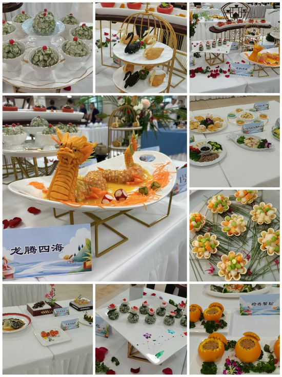 本次比赛共分专业组(7队)和业余组(8队)。高职学院参加专业组比赛,最终以养生石榴包、天鹅酥、龙腾四海、金瓜酒香肉、乾坤绣球5个作品完赛。主菜龙腾四海成为全场焦点,选手将虾肉、土豆泥、芝士完美融合,口感鲜香脆嫩,香气浓郁醇厚,色相鲜艳亮泽,菜品摆盘大气雍容,以献礼中华人民共和国成立75周年为构思,寓意伟大的祖国繁荣昌盛,龙腾四海!