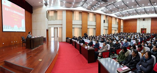图说:签约仪式前,十九大代表,松江区区委书记程向民应邀为工程大党委中心组理论学习会上作专题辅导报告。来源/上海工程技术大学
