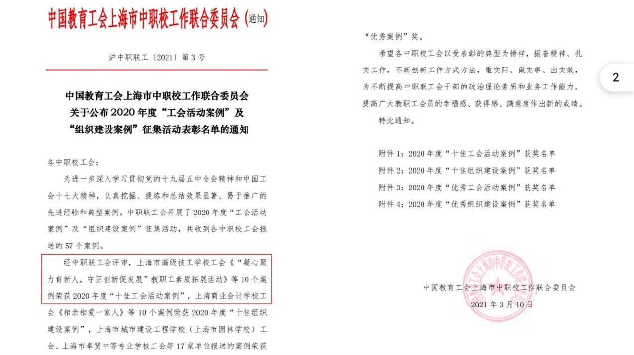 为进一步全面贯彻落实党的十九大和十九届二中、三中、四中、五中全会和中国工会十七大精神,认真挖掘、提炼和总结效果显著、易于推广的先进经验和典型案例,中职联工会开展了2020年度“工会活动案例”征集活动,中职校工会共报送了33个案例。经中职联工会评审,上海市高级技工学校工会《“凝心聚力育新人,守正创新促发展”教职工素质拓展活动》荣获2020年度“十佳工会活动案例”。