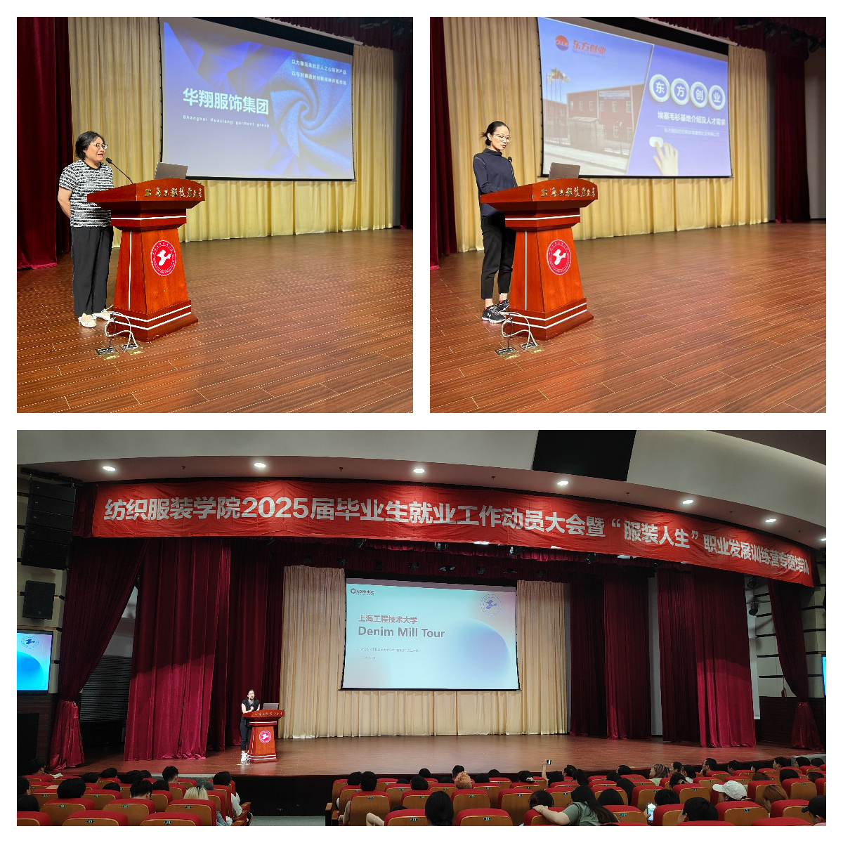 海星纪元CEO魏晓雨为同学们做就业形势解读及创业指导。CFW服装人才网猎头事业部陈杰为毕业生进行了行业分析及职业规划指导。东方国际创业股份有限公司、广东前进牛仔布有限公司和上海华翔服饰集团有限公司的HR分别做宣讲,为毕业生们提供了宝贵的就业信息和职业规划建议。