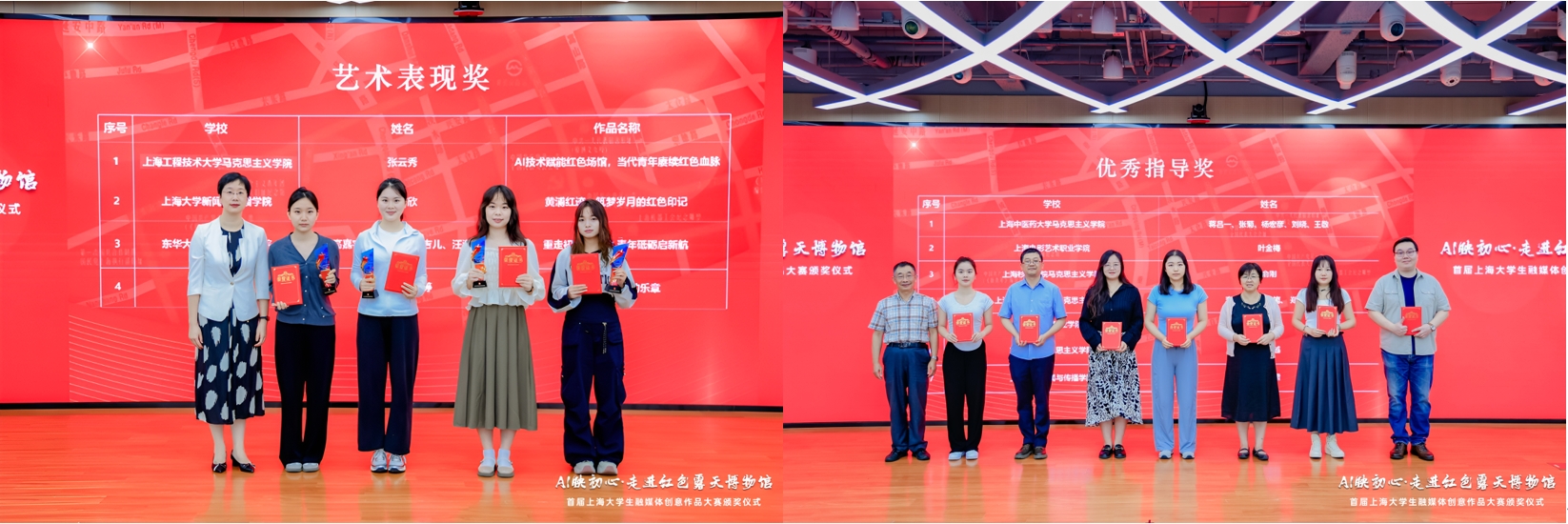 9月29日,“AI映初心·走进红色露天博物馆”首届上海大学生融媒体创意产品大赛颁奖典礼圆满落幕。马克思主义学院在此次大赛中表现突出,共获得6项荣誉。其中,马克思主义学院荣获“优秀组织奖”;董旖旎、李卓繁、郑文静荣获“优秀指导奖”;作品“AI技术赋能红色场馆,当代青年赓续红色血脉”(作者:张云秀)荣获“艺术表现奖”;作品“AI技术赋能红色露天博物馆之青年团旧址篇”(作者:章莹莹、轩璇)荣获“原创之声奖”。