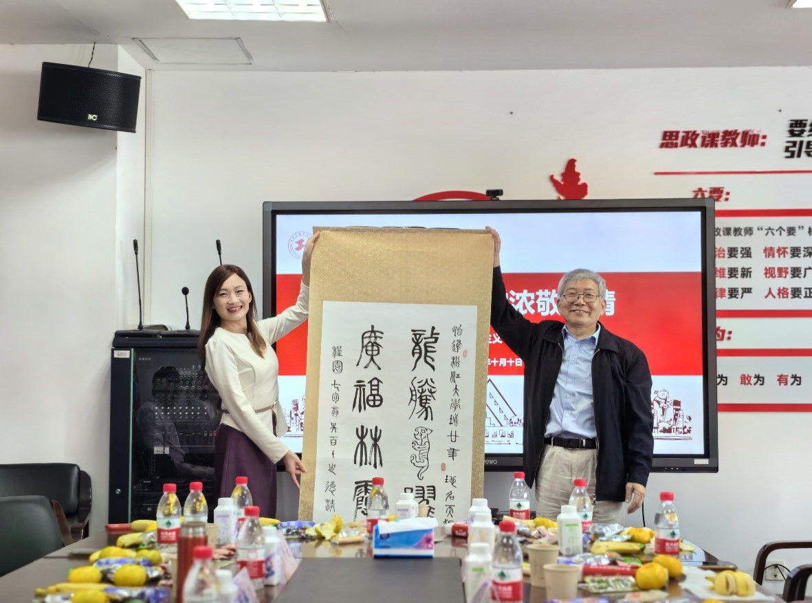 座谈会开始前,退休教师代表吴德清老师展示了赠送给学院的书法作品,并进行了简要介绍。会上,学院党委书记董旖旎对参加此次座谈活动的退休教师送上诚挚的节日问候,并向大家介绍了学院近年来党政主要工作和教学、科研的斐然成绩。退休老教师们表示,诚挚感谢学院给予他们家的温馨感,对于马院近年来突飞猛进的发展感到欣慰,希望学院发展越来越好。此外,大家还畅谈了退休后丰富多彩的生活,现场一片欢声笑语。