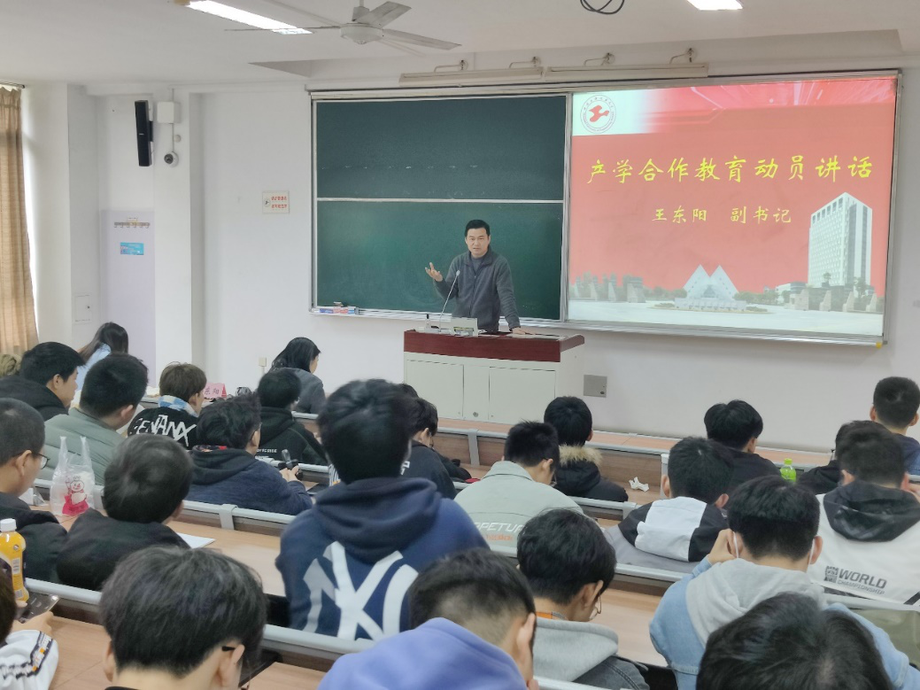 会上,王东阳副书记作动员讲话,他向同学们介绍了学校产学合作教育30多年的发展历程、办学特色,并指出产学合作教育是学生预就业工程的重要组成部分。他希望同学们珍惜产学合作教育机会,努力将所学运用到实践中,通过产学合作教育进入企业、进入社会,从而主动提升能力,明确发展方向,转变就业观念,争取素质提升。