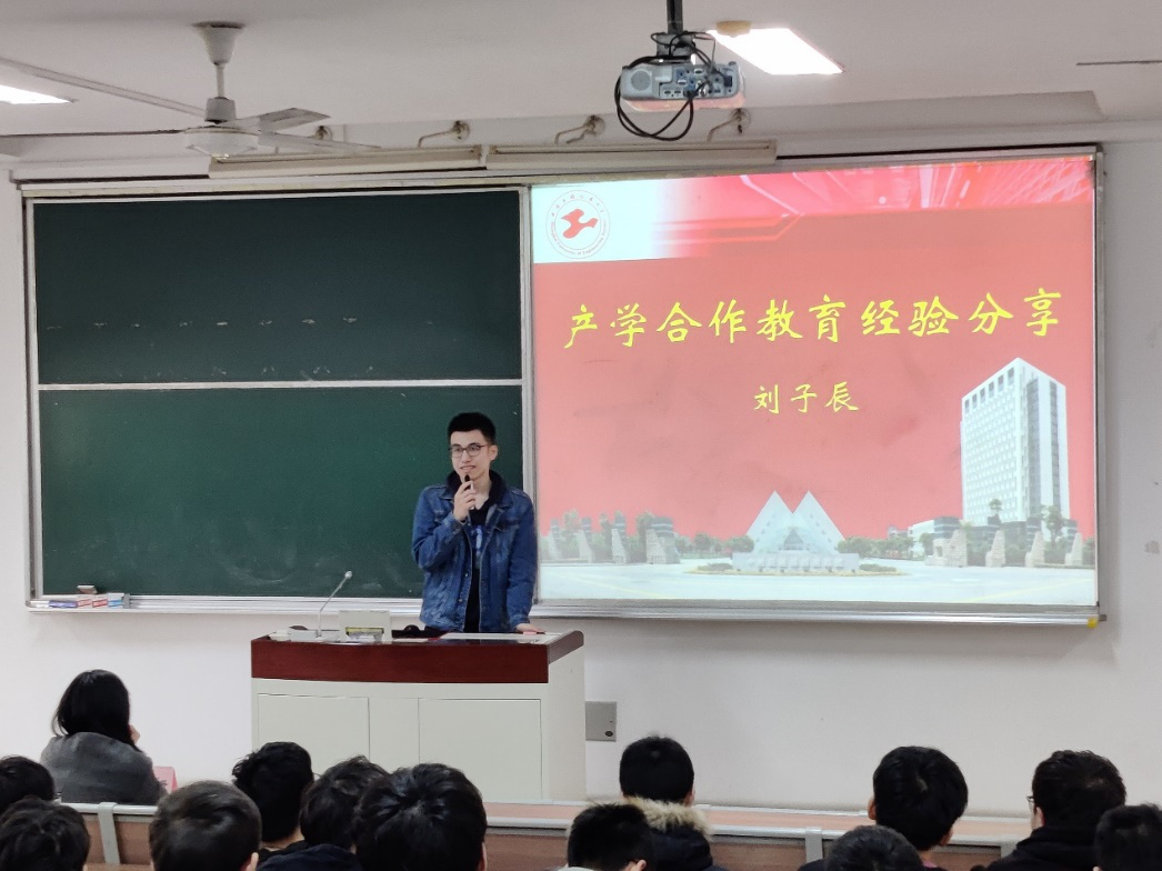 学院2019年产学合作优秀业务报告获得者刘子辰同学为学弟学妹们分享了自己在产学合作中的所想、所感、所获以及做好产学合作教育的经验方法。他呼吁学弟学妹们在参加产学合作教育的过程中,时刻保持主动学习的心态,珍惜机会,争取获得个人成长。