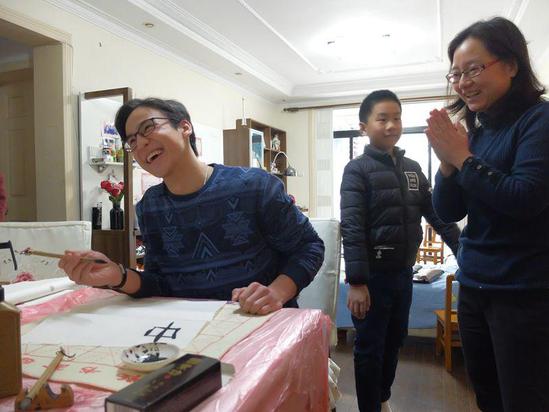 在导师熊筱晶家中的台面上,来自哈萨克斯坦的留学生桑彦第一次见到中国毛笔。在熊老师儿子萌萌的示范下,桑彦捏起笔来。“你想写什么?”老师问桑彦。“我想写:我爱你……”全家人大笑起来,老师说:“哈哈,中国人可能比较含蓄,不太写这个……”