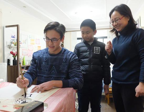 “饺子我们也吃,就是样子不大一样。”原来,桑彦与叶苏丹国家的传统是“女主内”,饭菜都是女主人的事,因此擀面、包馅之后,他们说“感觉自己变成了‘妻子’”。令他俩最感新奇的就是老师家中满墙的书画作品,从“雄鸡报晓”到“琵琶满枝”,它们大多是熊老师四年级儿子萌萌的习作。萌萌从墙上取下一幅《诗中有画》的正楷书法,请饶有兴趣的“洋哥哥”练练笔。