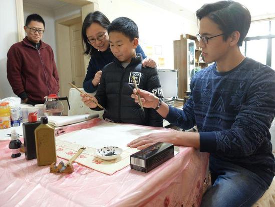 熊筱晶老师和她儿子在家中教哈萨克斯坦留学生桑彦练**法。徐瑞哲 摄