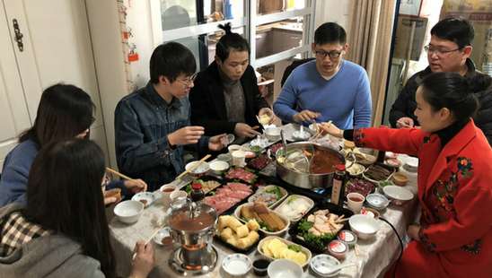 享家宴、尝年味的,还有一些贫困学子。其中,艺术设计学院的闵同学,是由于父母在外打工无法返乡,自己无奈之下也只能留校。当接到导师徐竟园老师的邀请电话时,闵同学心里暖洋洋的,竟抑制不住热泪夺眶。在导师家中,徐老师请相伴而来的同学们吃了一顿丰盛的鸳鸯火锅,还拨通了闵同学父亲的视频电话,和学生一起送去了农历新年的问候和祝福。他父亲说,“工程大老师真是有心,想得比我们家长还周到。”这个小年夜,所有留校中外学生都受邀共聚共享校园团圆饭。