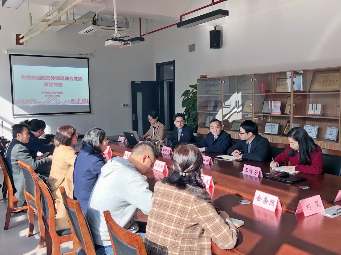 为落实巡察整改,对标样板,进一步提升党支部建设水平,3月26日,数理外国语联合党委书记钱慧敏带领组织员、支部书记、支部委员一行赴城市轨道交通学院学习全国样板支部建设经验。城市轨道交通学院党委书记柴晓冬热烈欢迎来访一行,学院党委副书记盛知恒,副院长、教工第一党支部书记郑树彬,通信信号系主任、教工第一党支部副书记魏丽丽参加交流会。