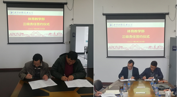 会上,部门党政主要领导与班子成员、党支部书记、教研室主任等签署了《体育教学部党总支2021年全面从严治党责任书》。