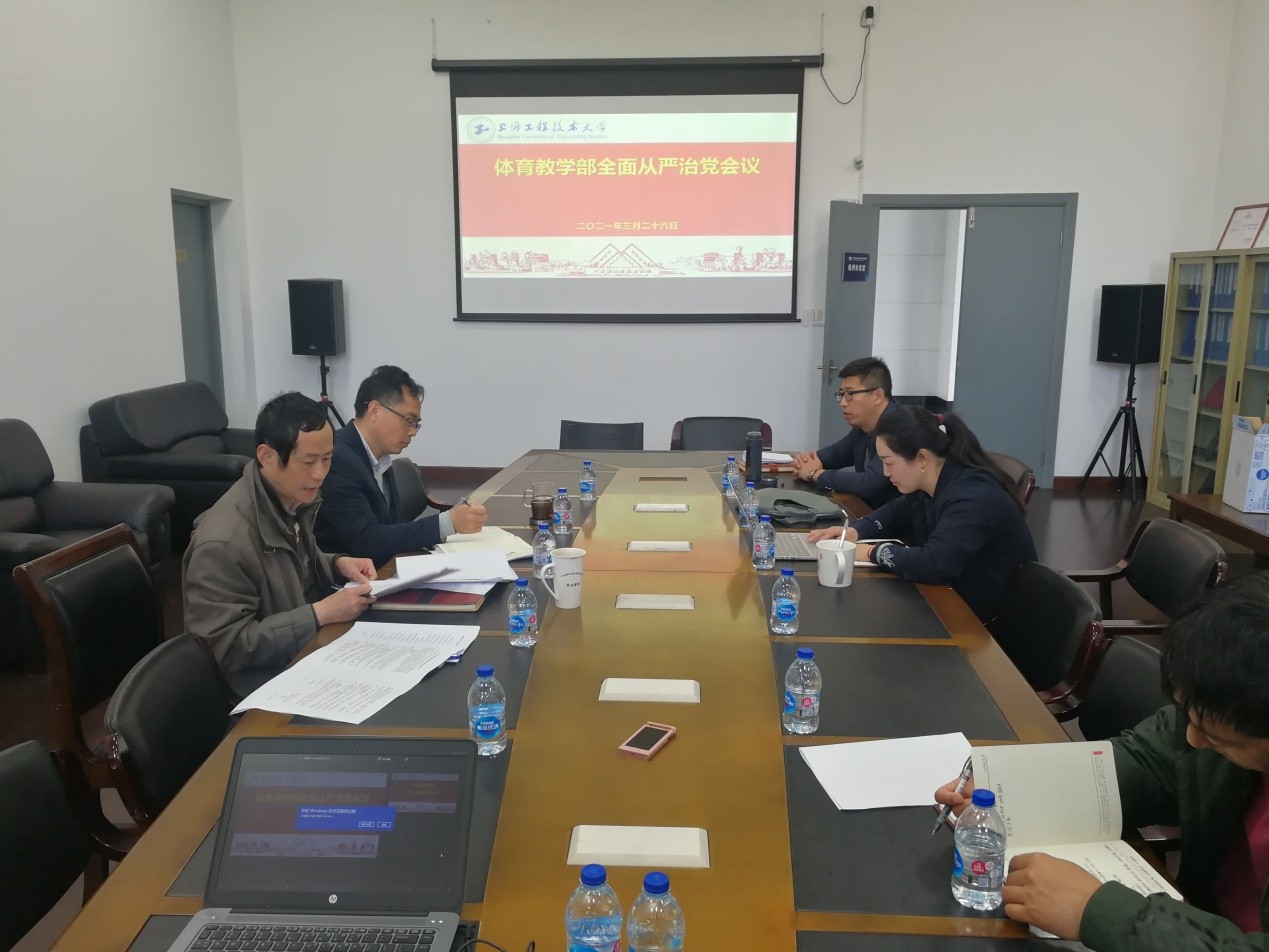 为深入贯彻党的十九大和十九届五中全会精神,全面落实十九届中纪委五次全会、十一届市纪委五次全会和学校全面从严治党会议精神,进一步推进体育教学部全面从严治工作向纵深发展,3月26日上午,体育教学部在体育馆201会议室举行了全面从严治党工作会议。部门党政领导班子成员,支部书记和教研室主任参加会议,会议由党总支书记王振钧主持。
