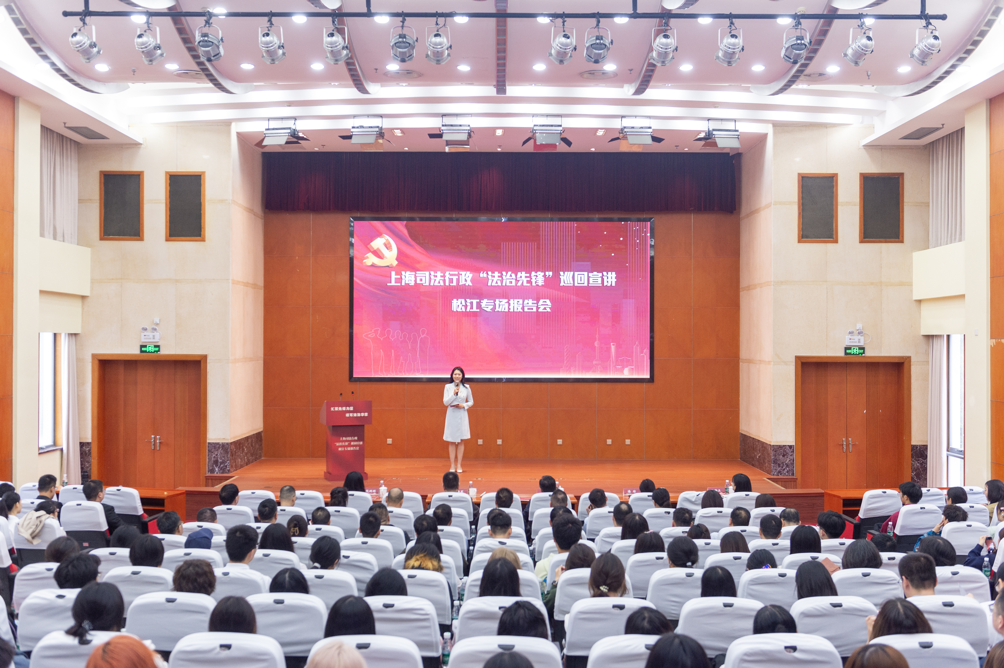 10月16日,由上海市司法局主办的上海司法行政“法治先锋”巡回宣讲松江专场报告会在我校举行。校党委副书记、副校长朱晓青,上海市司法局党委委员、二级巡视员张祎,松江区委常委、政法委书记陈晓军出席活动。