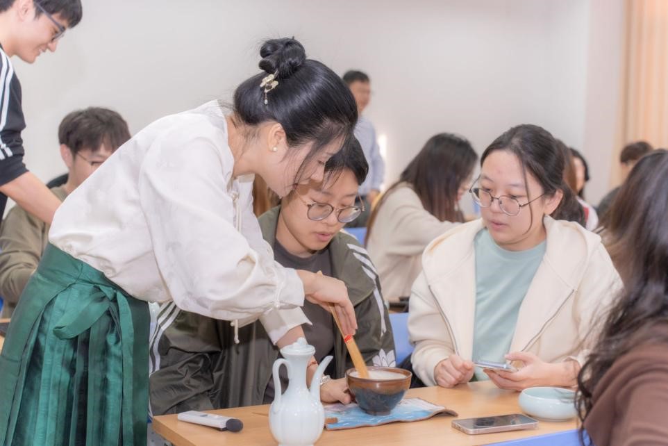 课堂上,孙老师向同学们介绍了点茶文化的历史发展、宋代点茶的具体技艺流程、器具以及品鉴方式。点茶追求茶汤的美感和形式美,茶具的配备最为精致,对茶艺要求也最为高级复杂。在老师的帮助下,同学们开展了点茶技艺实践,大家兴趣盎然,动手实践制作出属于自己的一份“宋代点茶”。