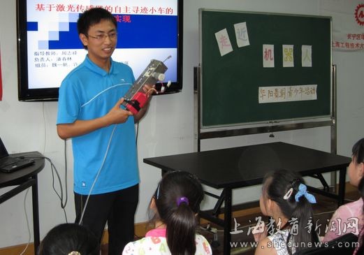 工程大学子为孩子们上课 除了完成高空作业、做到灭火减灾,机器人还可以跳舞,更能来上一场搏击赛。日前,上海工程技术大学机械工程学院学生携机器人走进长宁区华阳街道,为社区孩子带来生动一课。 小老师难问倒 “大螃蟹”成明星 “我曾拆过我家电视机”、“我参加过太阳能小车大赛”、“我还组装过电动模型”……问及生活中有无接触到机械,孩子们争先恐后地说了起来,其中最大不过刚升初中,最小的才读小学。“不能小看这些小朋友,他们懂的比我想象中更多,连环发问的威力也不小。”看着孩子们不时围上前来观看机器人的兴奋劲,作为《走进机器人》大型科普活动的主讲人,上海工程技术大学机械工程学院大三学生潘春林说道,“起初担心孩子们对机器人的理解还停留于搭积木,特别是女孩子可能会提不起兴趣,现在看来是多余的。”相较男孩,女孩对机器人的热衷丝毫不减,在小学四年级的玲玲口中机器人可比钢琴有趣多了。 为了让孩子们容易理解,小潘老师以生活小事为例深入浅出地讲解了机器人的构造及用途,并打破了孩子们对机器人需为“人型”的思维定势。面对孩子们天马行空的提问,潘春林更是哭笑不得,真正上演了一场科普知识的头脑风暴。 “想不到机器人第一次走进‘开心独立营’就那么受欢迎,‘大螃蟹’更成了明星。”为了提高孩子们对机器人的兴趣,开心独立营活动负责人蒋超浩更别出心裁地为机器人取了名字,“大螃蟹”便是其中一款,曾获华东赛区三等奖的飞思卡尔智能车。“孩子们能对机器人产生浓厚的兴趣便是对我们作品最好的认可。” 发挥专业重要 关爱需列第一 今夏,机器人的到来为社区孩子们掀起一股“科技热”。为了解决暑期双职工家庭孩子的生活与学习问题,不同于一般的暑托班,“开心独立营”是上海工程技术大学机械工程学院与长宁区华阳街道合作开展的特色活动,如今已是开营的第六个年头。 “从暑期前我们就开始招募小老师,征集上课方案。相比往年的沪语、电影赏析、趣味游戏等,今年的机器人更是着眼于我们自身的专业。”蒋超浩认为,“这次我们不仅仅是把机器人带进了社区,更要将科学知识普及给孩子们。知道他们自己会去看、想要看天文、生命科学等科技类读物时,我觉得我们做到了。”考虑到小学低年级孩子们注意力较为分散,蒋超浩在安排上适当地缩短了课时。“除了知识的普及,关爱儿童更是需列第一,安全便尤为重要。”为了保证孩子们的安全,开心独立营的成员们更是做到无微不至,在孩子们来到教室前排好座位,更是一张张椅子检查过来,甚至是椅背也不落下。 工程大学子将所学转化成便民工具,更好地去服务社会,此举更得到了长宁区华阳街道老师们的一致好评,“我觉得为小朋友普及科学知识很有必要无论是之前的绿色环保活动,还是此次《走进机器人》都非常的成功,工程大的学子很具有责任意识。”青少年辅导员张钰琪认为,“大学生暑期社会实践能参与到社区服务中,不仅对他们的成长有益,同时也为社区注入了新的活力。” |