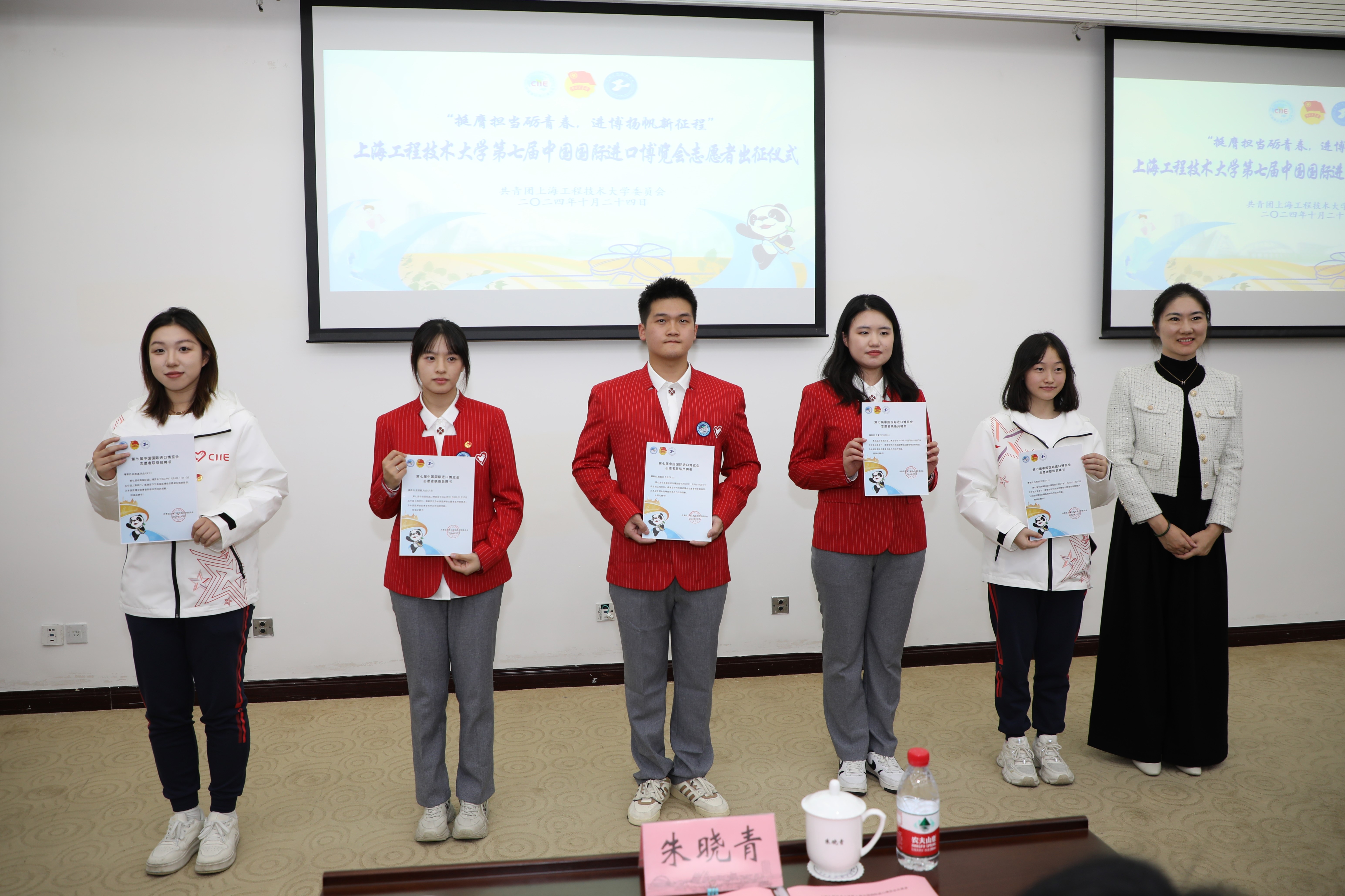 10月24日下午,“挺膺担当砺青春,进博扬帆新征程”——上海工程技术大学第七届进博会志愿者出征仪式在图文信息中心第三报告厅举行。校党委副书记、副校长朱晓青,党委组织部副部长顾守进,党委宣传部副部长、精神文明办公室主任祝玥,校团委书记陈翼然,校团委副书记徐靓雯,各学院团委书记,第七届进博会志愿者等100余人出席本次活动。